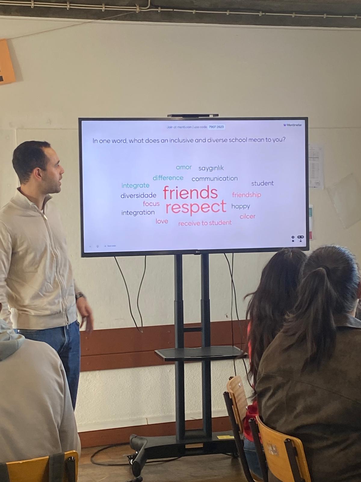 Sabah oturumunda IT öğretmenimiz, öğrencilere “Kapsayıcı ve farklılıklara saygı duyan bir okul deyince aklınıza ne geliyor?” sorusunu yönelterek dijital bir beyin fırtınası başlattı. Öğrenciler; eşitlik, erişilebilirlik, güvenli alan, farklı kültürlere saygı, biz duygusu ve teknoloji destekli öğrenme gibi kavramlar üzerinden fikir üretti.
