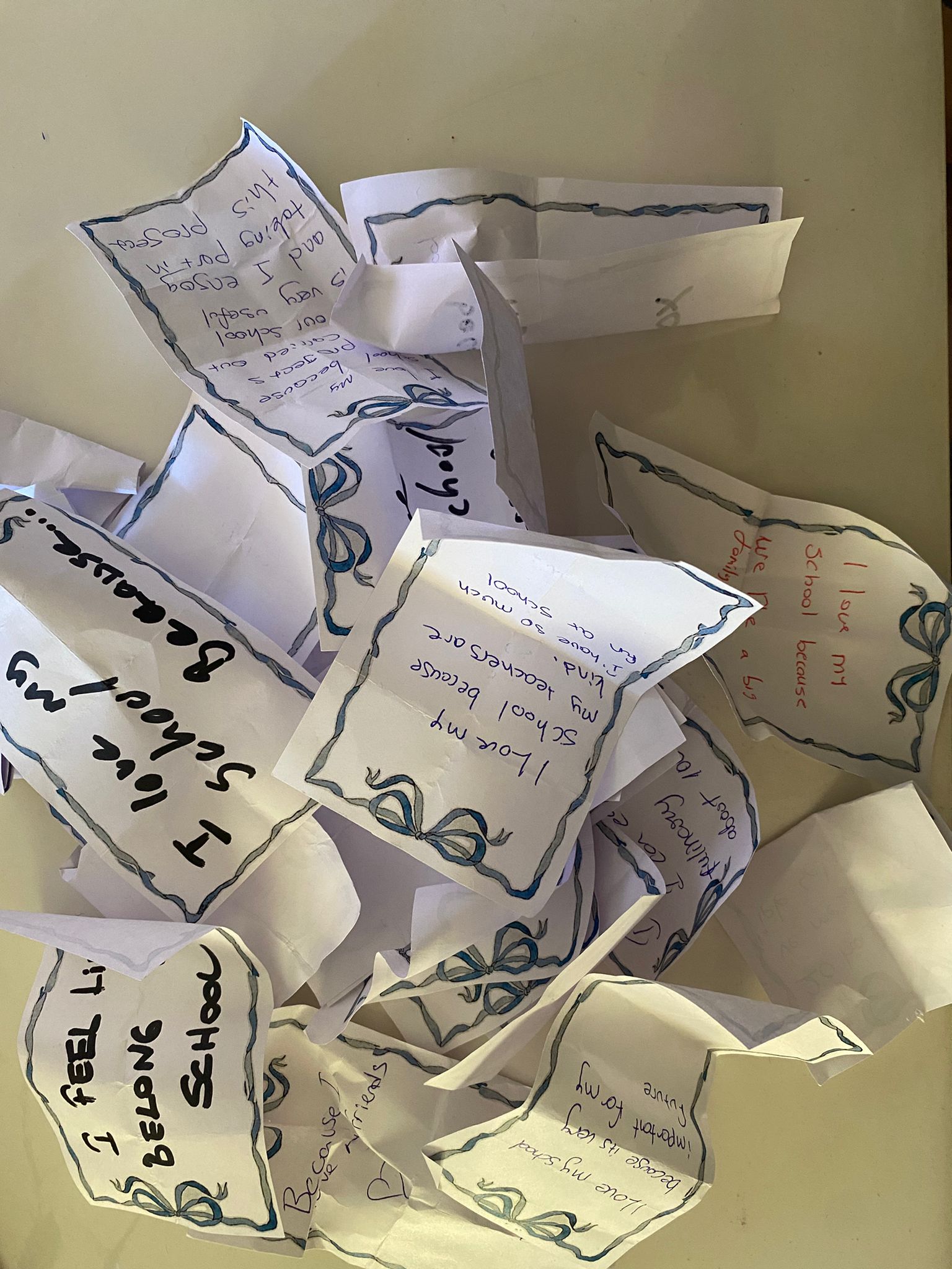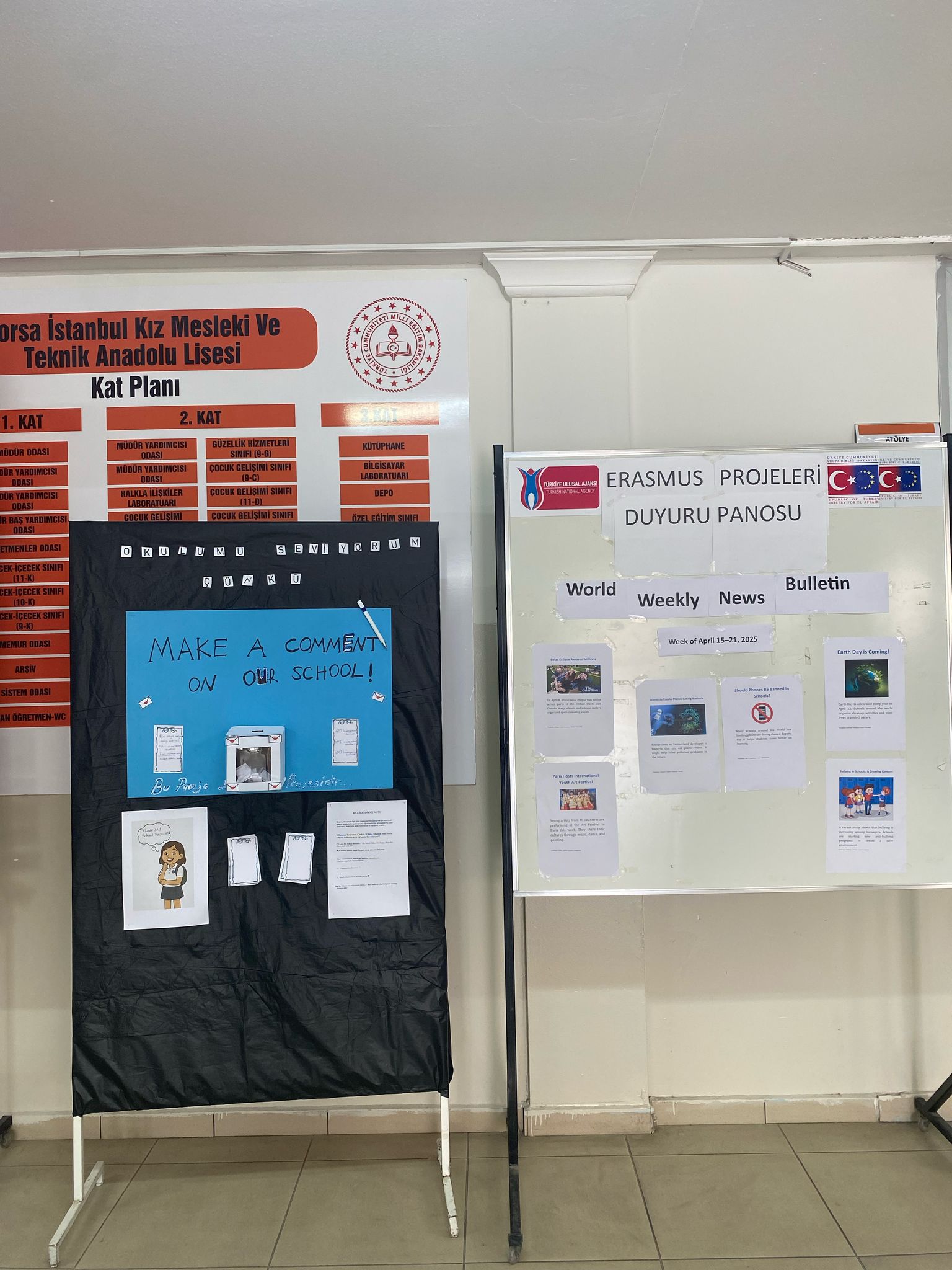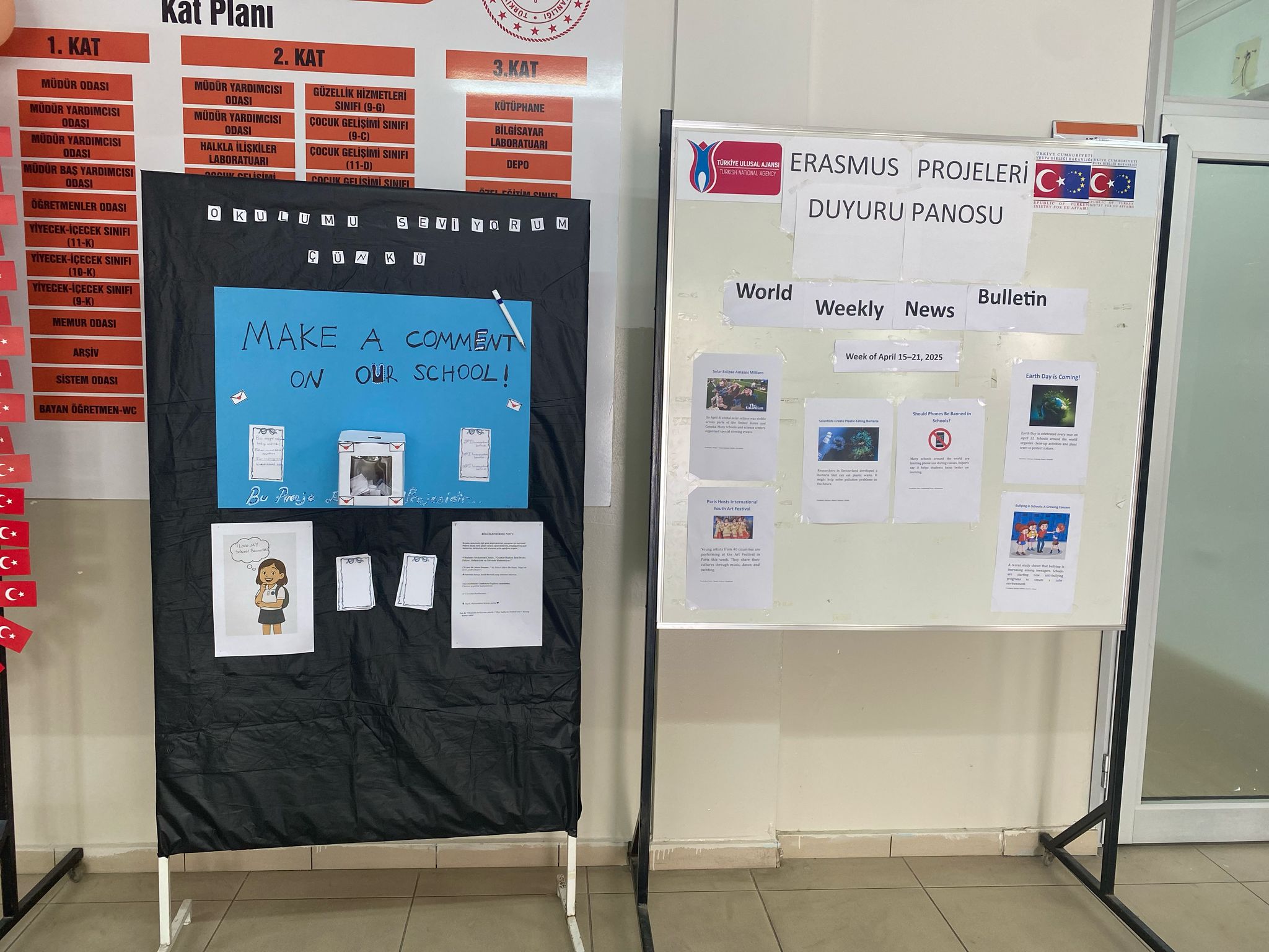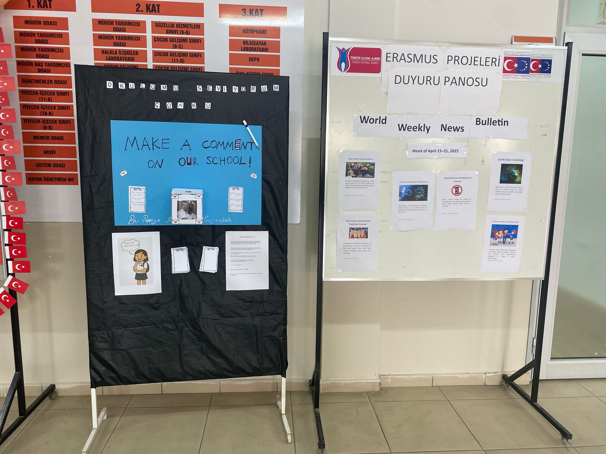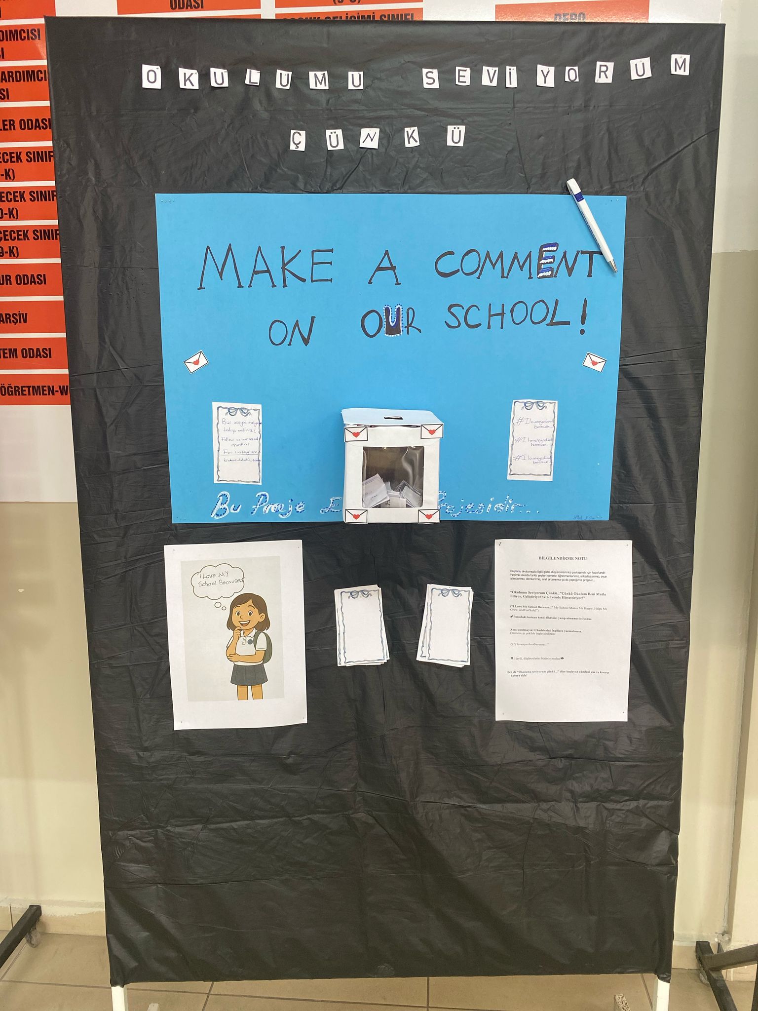 Okul proje panomuzda ingilizce kullanımını ve öğrencilerimizin okula bağlılıklarını arttırmak amacıyla “why do you love our school?” sorusunu sorduk ve cevaplar aldık.Bunun sonucunda proje faaliyetlerimizi revize etme şansı bulduk.